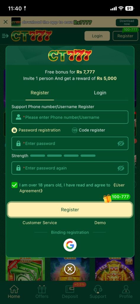 Login and Registration Of CT777 Game Download Apk
